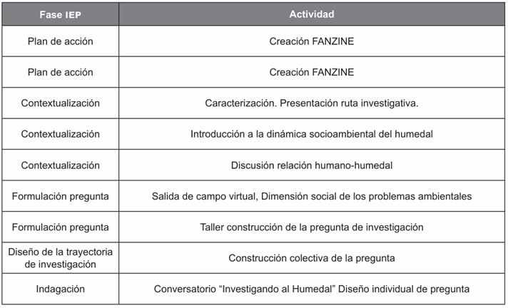 Para dar continuidad al proceso de educación ambiental que se desarrolló con otros compañeros del ciclo investigativo-pedagógico, se adaptaron las etapas de la iep que proponen Mejía y Manjarrez (2012) en el marco del programa Ondas **** de Colciencias.