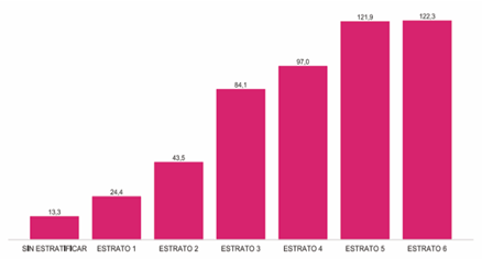 Nota: La figura muestra la velocidad de descarga de internet de los hogares de acuerdo con el estrato socioeconómico, donde se evidencia la brecha de desigualdad.