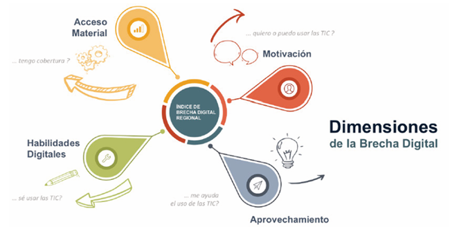 Las diferencias en la apropiación de las Tecnologías de la Información y las Comunicaciones (tic) entre los ciudadanos de las diferentes regiones del país; dicha apropiación está determinada por 4 dimensiones: 1) el grado de motivación, 2) el acceso material, 3) el dominio de habilidades digitales y 4) el aprovechamiento que se da a estas tecnologías. ( MinTIC, 2020, p. 18)