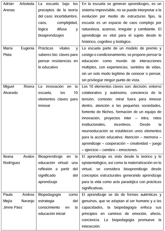 Se propone, entonces, una integración de elementos de corte socioemocional y relacional en los diseños curriculares, a través de las mallas, y sobre todo evidenciables con claridad en las herramientas didácticas del docente, para que el acompañamiento sea óptimo, recíproco y acorde para el desarrollo humano de los estudiantes, quienes se formarán para la vida desde la relación misma de su emocionalidad. En cuanto a los elementos del bioaprendizaje en los procesos de desarrollo pedagógico, la investigación logró reunir información sobre este tema, lo que logra que hablemos de definiciones claras, tanto del bioaprendizaje como de los elementos que permiten que este se dé. Así pues, los ámbitos escolares permiten que el sujeto construya nuevos aprendizajes y tengan una interrelación con el ambiente natural, resignificando el conocimiento desde la interacción y la autoorganización desde la retroalimentación.