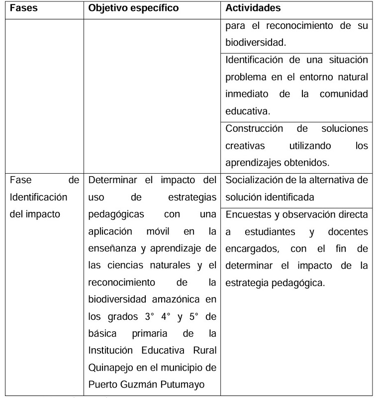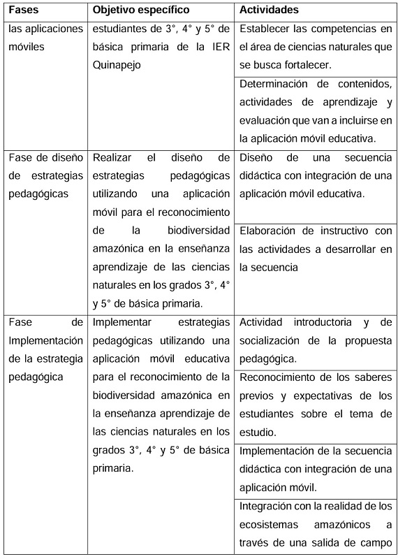 El proyecto se desarrolló en cuatro etapas, la primera, consistió en el diagnóstico y reconocimiento de las posibilidades y oportunidades que representan las aplicaciones móviles en los procesos de enseñanza aprendizaje de las ciencias naturales, en la segunda fase se realizó el diseño de la secuencia didáctica y de la aplicación móvil Amazonía biodiversa, tomando como referentes los documentos institucionales PEI y plan del área de ciencias naturales de la Institución Educativa Rural Quinapejo y los lineamientos, mallas curriculares y estándares básicos del MEN para la asignatura. Durante la tercera etapa se llevó a cabo la implementación de la propuesta pedagógica, con integración de aplicaciones móviles y finalmente, en la cuarta etapa se recocieron los aportes de la estrategia pedagógica implementada y se analizaron los resultados para determinar su impacto en las variables de análisis propuestas.