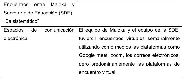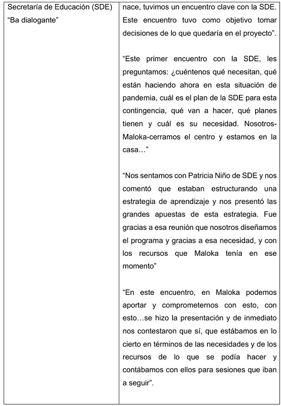 En este punto, exponemos la relación que hubo entre el equipo de Maloka y el equipo de la Secretaría de Educación del Distrito (SED), para apreciar y valorar las interacciones de conocimiento e información a través del “ba dialogante”.