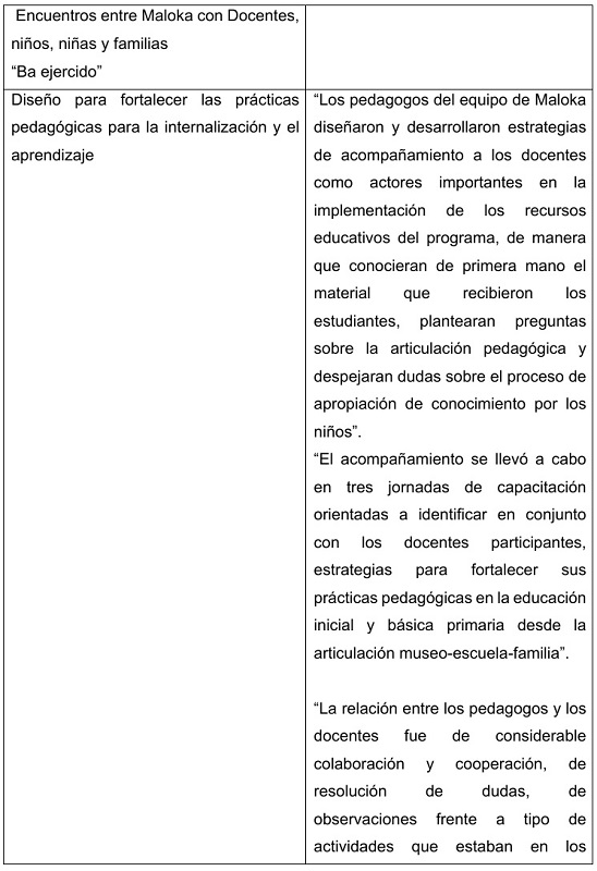 Ba Ejercido: El “ba ejercido” se observó en las acciones realizadas por el equipo de Maloka, desde el desarrollo de recursos educativos hasta su implementación por los docentes, estudiantes y familias. Las estrategias de acompañamiento permitieron la internalización de conocimientos y habilidades científicas, haciendo evidente el “ba ejercido” a través de la socialización y reflexión basadas en las experiencias de uso pedagógico de los recursos educativos.