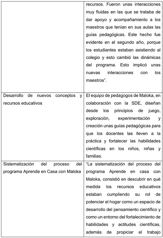 Interacción y Nuevos Conocimientos: El trabajo conjunto entre el Centro de Ciencia- Maloka y los actores externos resultó en nuevos conceptos de producción, diseños de productos y una mejor comprensión del escenario por parte de los docentes, estudiantes y familias. La retroalimentación sobre el uso de los recursos educativos y el conocimiento de proveedores externos y nuevas tecnologías también fueron beneficiosos.