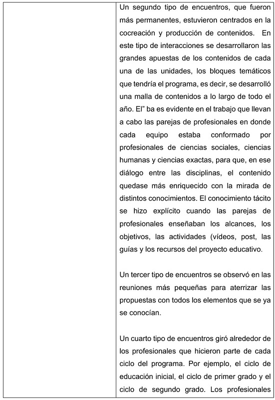 En relación con los aportes anteriores, en este tipo de ba, los equipos de Maloka y de la Secretaría de Educación intercambian y combinan el conocimiento tácito y explícito a través de tales mecanismos de intercambio como las reuniones y las conversaciones telefónicas. Esta manera de interacción concuerda con los aportes de Nonaka (1994) y Nonaka & Von Krogh (2009), al afirmar que la reconfiguración de la información existente mediante la clasificación, el añadido y la categorización del conocimiento explícito puede llevar a nuevo conocimiento.