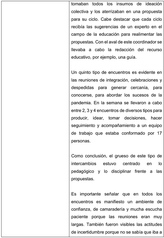 En el equipo, además de compartir los conocimientos tácitos y las experiencias, salieron a flote las emociones, los sentimientos y los modelos mentales de cada uno de los integrantes, evidencia que coincide con los aportes de Nonaka & Takeuchi (1995). Es importante señalar que en todos los encuentros se manifiesta un ambiente de confianza, camaradería y mucha escucha, porque las reuniones llevaban mucho tiempo. También fueron visibles las actitudes de incertidumbre porque no se sabía qué iba a pasar, no se sabía cuál iba a ser el resultado, pero también hubo mucha apertura, flexibilidad y confianza en las personas y en la dedicación al trabajo debido a que se hizo desde la virtualidad.