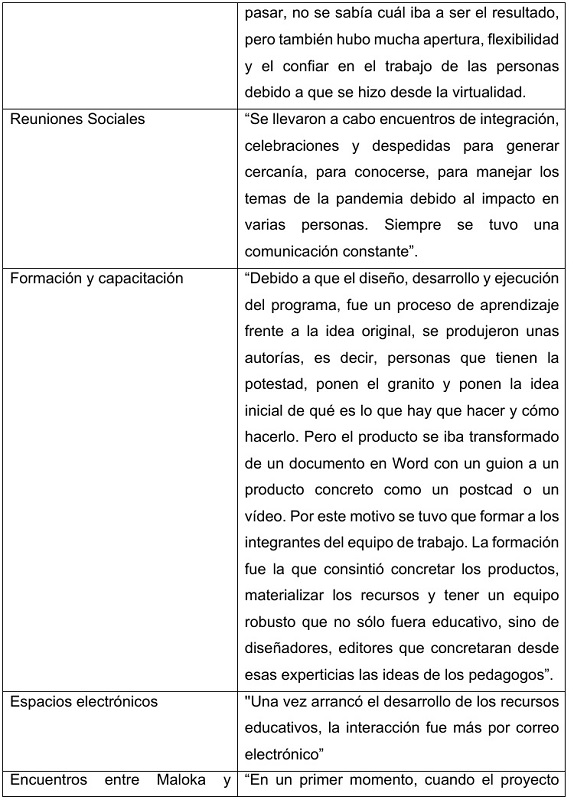 El equipo de Maloka se encarga de liderar los procesos de conceptualización, diseño pedagógico y producción editorial de los recursos educativos desde las necesidades e intereses generales de la Secretaría de Educación como aliado técnico del proyecto. El equipo está conformado por 7 pedagogos con formación en ciencias sociales, exactas y naturales, 2 editores, 3 diseñadores gráficos, 2 pedagogos que diseñan e implementan las estrategias de apropiación de los recursos, 1 proveedor de impresiones y 1 proveedor de distribución. En relación con la formación del equipo para socializar los conocimientos tácitos, observamos que existe una concordancia con los aportes de Nonaka (1994), en relación con el ba originador, desde el proceso de socialización, dado que se inicia con la construcción de un “equipo” o de un “espacio” de interacción. Este espacio facilita que los miembros del equipo compartan sus experiencias y perspectivas.