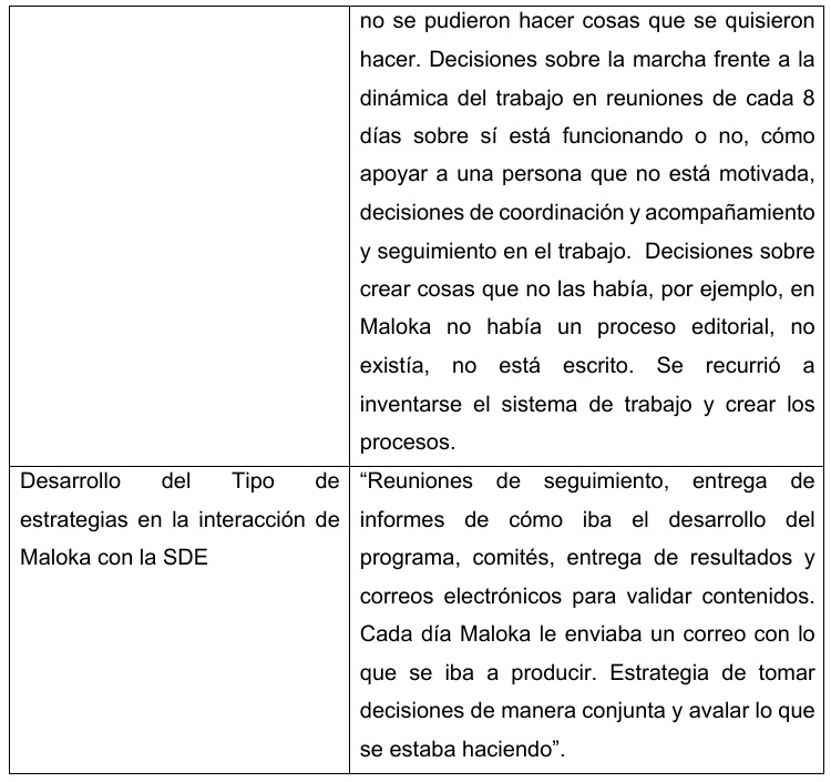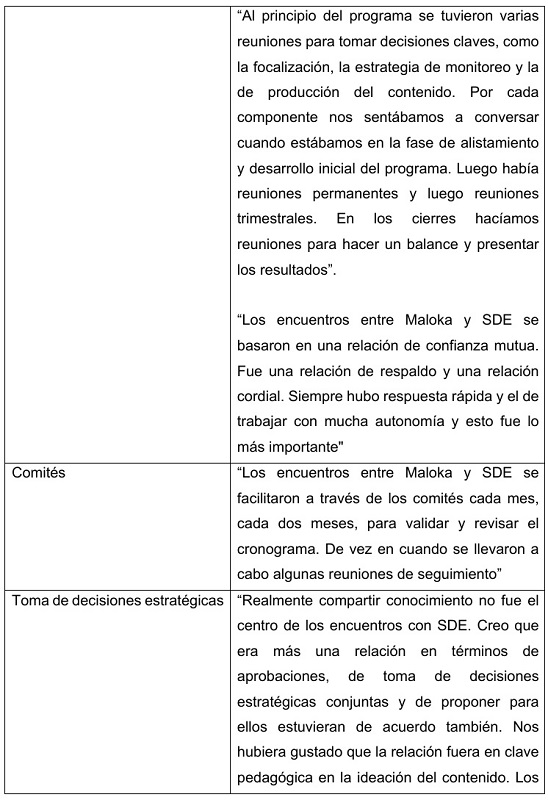 La relación de interacción entre el equipo de Maloka y el equipo de la SED fue en términos de aprobaciones, de toma de decisiones estratégicas conjuntas y de propuestas para que la SED estuviera de acuerdo. Los intercambios estuvieron más en clave de la toma de decisiones estratégicas para el programa. Por ejemplo: decisiones sobre los alcances pedagógicos, decisiones de diseño, decisiones sobre las habilidades y actitudes científicas a las que Maloka apostaría, decisiones sobre la narrativa, la secuencia, el material, y las zonas rurales y urbanas a las que se les llevaría el material impreso. Este tipo de interacciones entre los dos equipos coinciden con lo que Nonaka & Nishiguchi (2001) apuntan, al hallar que la mayoría, si no todo, el conocimiento se crea a través de un proceso interactivo de experimentación y diálogo, que involucra a varios individuos.
