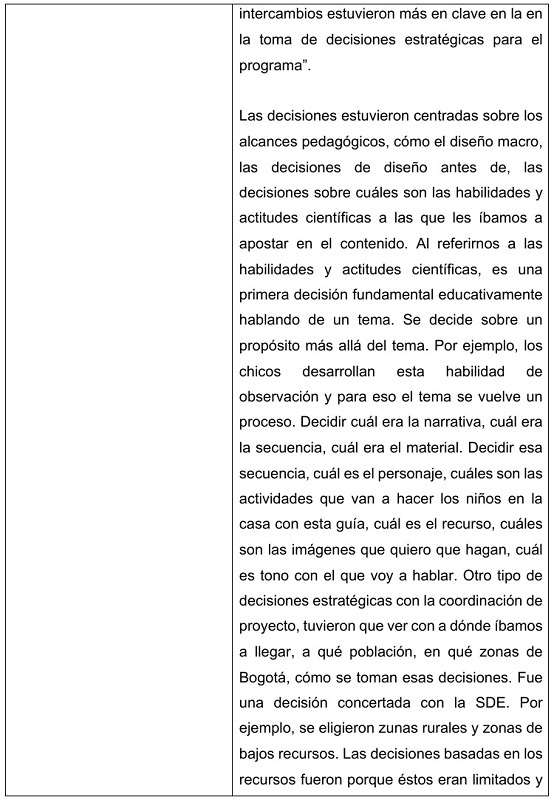 Una estrategia posterior evidente en el proceso del desarrollo del programa fue la sistematización, con el fin de revelar en qué medida los recursos educativos estaban cumpliendo su rol de potenciar el hogar como un espacio de desarrollo del pensamiento científico y como un entorno del fortalecimiento de las habilidades y las actitudes científicas, además de propiciar el trabajo colaborativo y el interés por la ciencia y la tecnología. De igual manera, se fomentaron los espacios de acompañamiento flexibles para articularlos con las necesidades del quehacer pedagógico de los docentes. Por último, el desarrollo de los espacios de trabajo colectivo en los que los docentes construyan y promuevan sus propias estrategias pedagógicas que dialoguen con la propuesta de os recursos educativos del programa.
