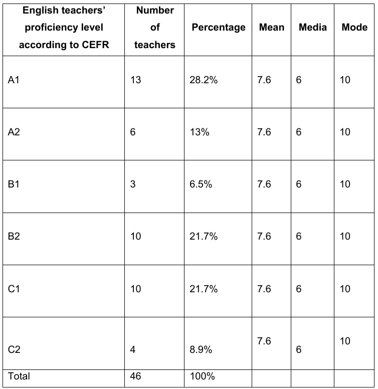 Regarding qualitative data, content analysis was selected as the technique to examine participants’ responses. Hernández et al. (1998) affirm that content analysis is a useful procedure to examine communicative processes in various contexts. The recordings of the focus groups were transcribed, and an emerging data grid was used to identify frequently mentioned aspects or common themes. The following section presents the findings, focusing on English teachers’ proficiency levels and their opinions on the implementation of bilingual policies.