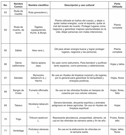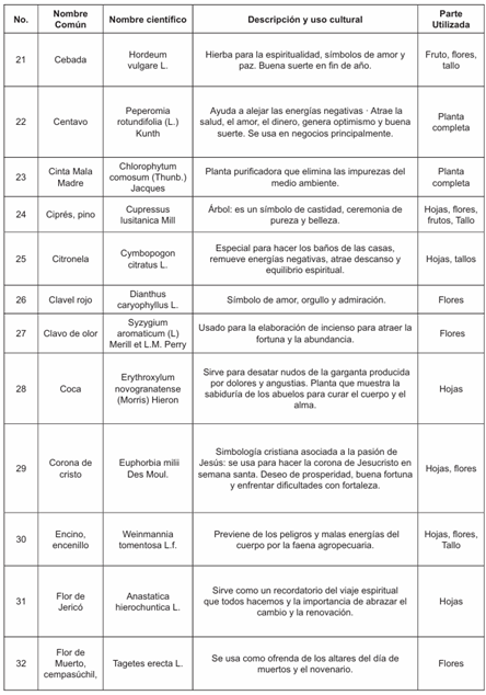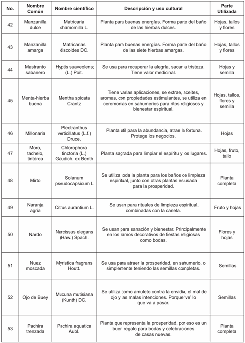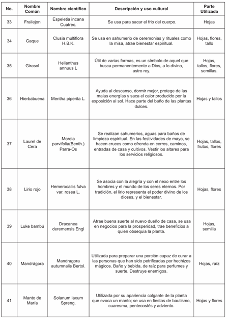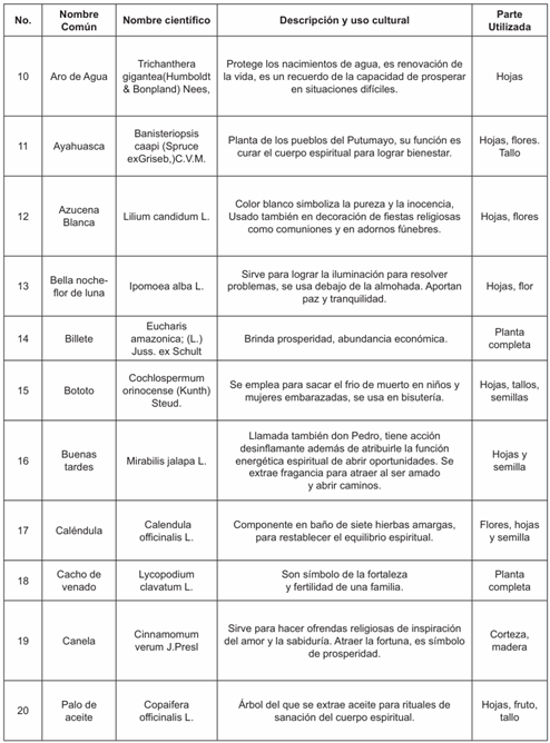 En la tabla 1 se muestra parte de la sistematización de información de la entrevista sobre el uso ceremonial de las plantas comercializadas en las dos plazas de mercado de Tunja, norte y sur.