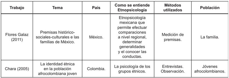 De manera que, despues de efectuar el anterior recorrido y poder ampliar el tema, se selecciona una serie de investigaciones donde se haga presente la etnopsicología, permitiendo un acercamiento inicial sobre los temas que se vinculan a esta disciplina en la actualidad, los tipos de metodologías que se utilizan, población y retos que se ha venido abocados en los estudios revisados, efectuando un acercamiento a las posibilidades de trabajo que se pueden efectuar.
