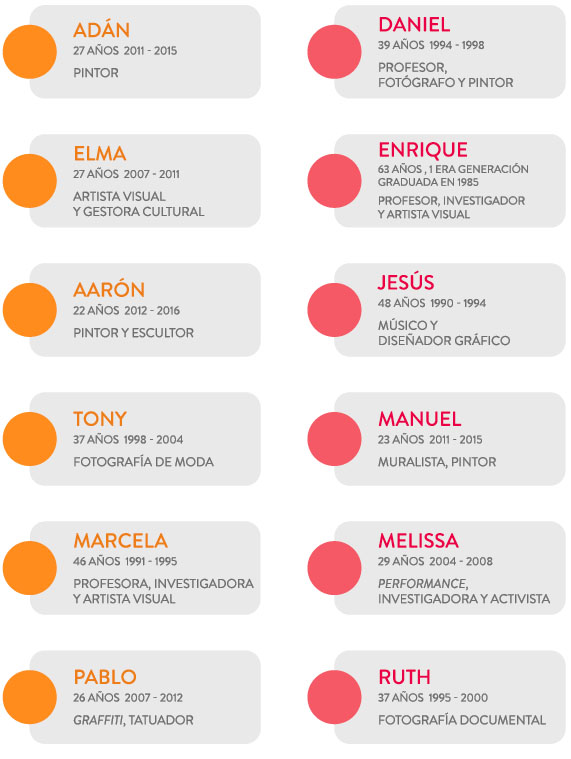 Los artistas visuales contactados fueron en total doce. Todos con distintas prácticas artísticas, edad, generación de egreso y proyectos profesionales, como se puede visualizar en el siguiente diagrama. Se buscó intencionalmente esta panorámica para obtener perspectivas desde distintos horizontes del arte, con la finalidad de explorar diferentes caminos (si es que hubiera) en la construcción del capital social. Es importante mencionar que, por cuestión de confidencialidad solo se muestra el primer nombre de los artistas.