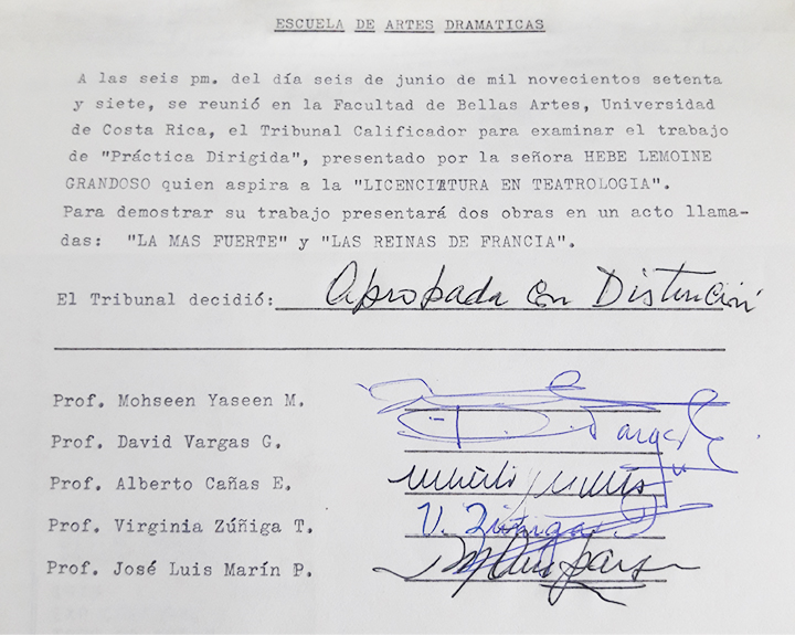 Debemos señalar que, en un primer momento de este proceso investigativo, el punto de arranque estaba fijado por un documento que aparece consignado en la base de datos del IIArte como una tesis de tendencia teórica, fechada en 1977, con el título “Noh: el teatro clásico de Japón”. Nuestra investigación, en los archivos de la EAD, nos permitió determinar que dicha tesis, escrita por Hebe Lemoine, nunca fue sometida a un tribunal examinador, pero terminó filtrada en el Sistema de Bibliotecas, Documentación e Información de la Universidad de Costa Rica (SIBDI) con el código de identificación TFG 7627. Manuel Ruíz indica que la propuesta de tesis fue rechazada por una autoridad universitaria, de manera que la estudiante Lemoine terminó por licenciarse en teatrología bajo la modalidad de práctica dirigida (comunicación personal, 18 de junio, 2018). Su trabajo, aprobado con distinción por el respectivo tribunal calificador, consistió en la dirección de las obras “La más fuerte” [de August Strindberg] y “Las reinas de Francia” [de Thornton Wilder], tal y como se constata en la Figura 1.