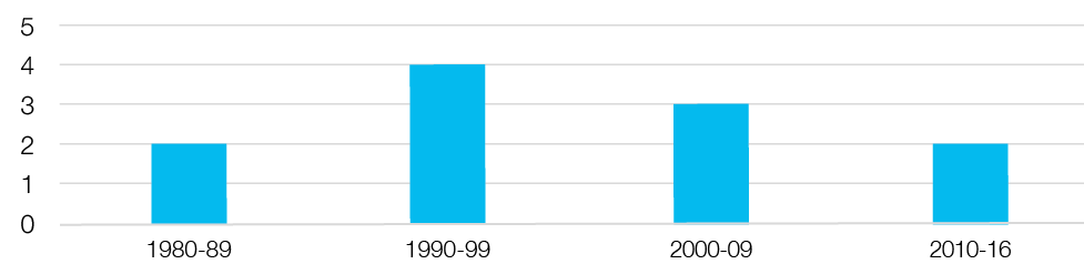 Sin embargo, para Toruño (2011), la década de 1990 inicia con una EAD atravesada por diversas crisis. En primer lugar, el aumento de la población estudiantil genera presión sobre una infraestructura que no está en capacidad de satisfacer la demanda de espacio para los procesos de montaje, ensayos y otras actividades formativas. Además, el retorno del TU a la esfera de la EAD no estuvo apoyado por los recursos presupuestarios o administrativos necesarios. A pesar de lo anterior, este periodo fue fructífero por la visita de docentes internacionales y la incorporación de la EAD a organismos y redes internacionales. Es notable que, como resultado de los cambios en la dirección de la EAD, a partir de 1988, y el mayor roce del estudiantado con profesores internacionales, sea la década 1990-99 –tal y como se indica en la Figura 2– en la que observamos la mayor cantidad de tesis de tendencia teórica de todo el periodo analizado.