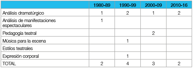 Como se muestra en la Tabla 1, las tesis de este corpus abarcan una amplia gama temática. Del abordaje de cada tema, se puede derivar una idea constitutiva o, para ser más precisos, una base epistemológica sobre la que se sustenta la concepción de teatro manejada por cada autor o autora.