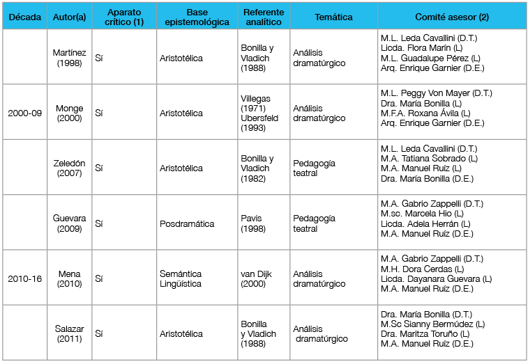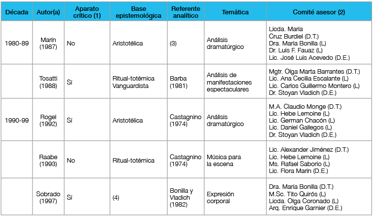 Para los efectos de la presente investigación tenemos que, entre 1987 y 2016, se postularon 35 trabajos finales de graduación para optar al grado de licenciatura en la Escuela de Artes Dramáticas (EAD), según la data del Instituto de Investigaciones en Artes (IIArte, 2018). De estos trabajos, 24 fueron tesis, 8 fueron proyectos, 2 fueron prácticas dirigidas y, finalmente, hubo un seminario de graduación. Hemos recortado nuestro corpus a 11 tesis, por estar orientadas hacia la investigación teórica, según la caracterización establecida en la base de datos citada2. Esta primera delimitación de enfoque establece un lapso comprendido entre 1987 y 2011. Su punto de partida es la tesis de Marín (1987) y su cierre es la tesis de Salazar (2011). Sin embargo, extenderemos el recorte del periodo hasta el 2016 por dos motivos: el primero es que, durante ese año, se aprueba el último trabajo final de graduación consignado en la base de datos y, además, nos otorga un lapso de un lustro para examinar lo sucedido posteriormente a la aprobación de la tesis de Salazar, en 2011.