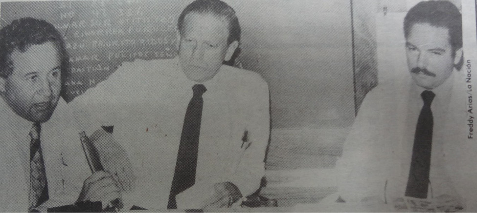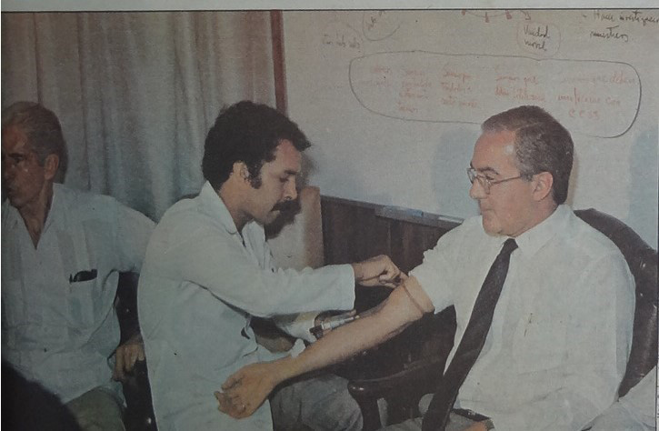 Una de las respuestas estatales que causó más polémica, fue la posibilidad de hacer obligatorias las pruebas que confirmaban la presencia del VIH en personas pertenecientes a ciertos sectores del país. En una fotografía que ocupó la portada de La Nación, el 25 de marzo de 1987, aparecen miembros del gabinete, encabezados por el Dr. Edgar Mohs como Ministro de Salud, sometiéndose a la realización de un sangrado para el correspondiente examen que determinaría el estado serológico de los funcionarios4. Es de destacar que el profesional en salud encargado de hacer el procedimiento aparece utilizando una gabacha, así como también un instrumental médico necesario para su labor. Así mismo, aparece en el fondo una pizarra con una escritura que no es legible para quien observe la imagen. La aparición de este último elemento, al igual que en una de las imágenes anteriormente abordadas, es fácilmente asociada con la transmisión de conocimiento verídico, así como también con la investigación médica, de tal forma que consiste en un objeto que refuerza la idea de un saber institucionalizado fidedigno.