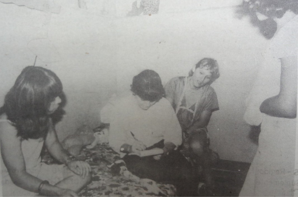 El 2 de setiembre de 1985 se publica un reportaje en el que una periodista entrevista a tres “travestidos”, los cuales son equiparados a “homosexuales que se visten de mujer”. Es interesante apreciar la poca especificidad para nombrar a los sujetos que interroga, ya que agrupa bajo un mismo término a una serie de categorías identitarias históricamente diferenciadas para la época. Dicha confusión conceptual aparece de manera recurrente en muchos de los discursos que abordaron a estos sectores de la población durante la década de 1980. En la fotografía se presentan cuatro mujeres, tres de ellas sentadas en una cama pequeña y una cuarta se encuentra de pie, mirándolas. La que se presume sería la periodista, se encuentra en el centro de la escena y parece tomar apuntes en un cuaderno que sostiene en una de sus manos. El único rostro que es posible observar es el de una de las entrevistadas, que se encuentra detrás de la periodista y dirige su mirada al cuaderno de esta. El protagonismo de la periodista en la captura fotográfica hace pensar en el heroísmo con que se suele retratar a algunos antropólogos mientras realizan trabajo de campo en sociedades “salvajes”, en tanto se les reconoce como “valerosos” por adentrarse en mundos a los que no cualquiera se atreve a entrar.