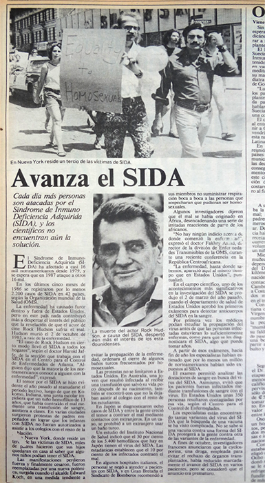 Una segunda noticia, que se emparenta con la mencionada anteriormente, aparece el 11 de enero de 1987, en la cual la imagen utilizada tampoco tiene relación directa con el texto que la acompaña. El mismo, a su vez, está cargado de metáforas militares, incluso el título de la misma: “Avanza el SIDA”. Sin embargo, un análisis más detallado permite observar la construcción de un mensaje a partir de la proximidad de ambas estructuras. La imagen presentada corresponde a una marcha en la ciudad de Nueva York, en la que es posible observar a hombres y mujeres caminando y sosteniendo carteles a favor de la igualdad de derechos para las personas homosexuales, en el primer plano de la fotografía destaca la frase “Equality to homosexuals [Igualdad a los homosexuales]”. Dentro del texto se abordan diferentes reacciones que se han suscitado en lugares como Estados Unidos, Australia, Japón e Italia a raíz de la presencia del virus en amplios sectores de la población. Nuevamente, las metáforas militares permean el discurso, entre ellas se habla de que el sida ataca; se menciona a los hemofílicos como las víctimas de esta situación. Además, se evidencia que en varios países se han establecido políticas para evitar el contacto con extranjeros y, finalmente, el título del artículo con la utilización del verbo “avanza”.