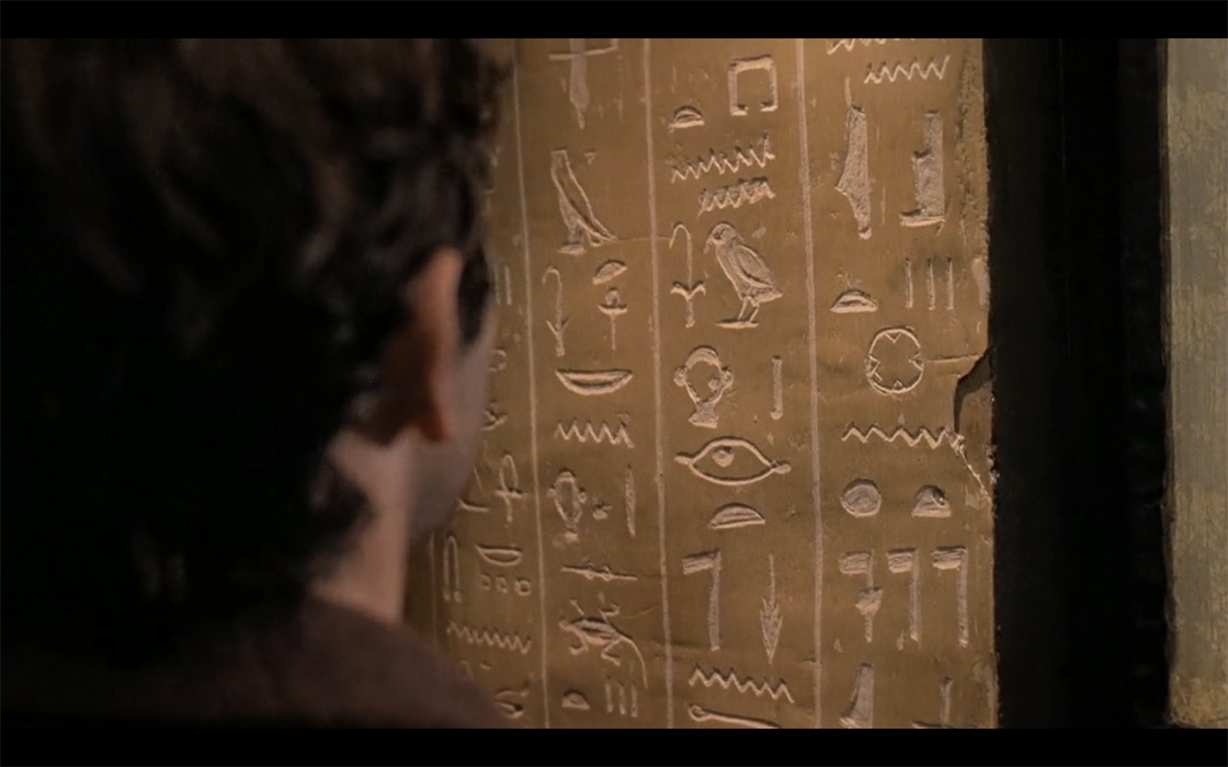 En El quimérico inquilino, la decoración historicista escogida es la decoración jeroglífica egipcia10(Imagen 7). En este caso, el juego se da con el protagonista de la historia o, mejor dicho, en el personaje que este se transforma. Conviene contextualizar argumentalmente: en el filme, el personaje protagonista de Trelkovsky (Roman Polanski) sufre de un desdoblamiento de la personalidad, por el que se va transformando11 en la anterior y fallecida inquilina de su nuevo apartamento. A lo largo de las secuencias descubrimos que, dicha inquilina era una gran apasionada de la historia y cultura egipcias. Por lo tanto, hay un posible significado en esa decoración de la pared acerca de la transformación de identidad que Trelkovsky está viviendo en el filme. Esta visión se ve reforzada, ya que a posteriori de este momento, el personaje se trasviste en la inquilina y pierde la noción psicológica absoluta sobre sí mismo.