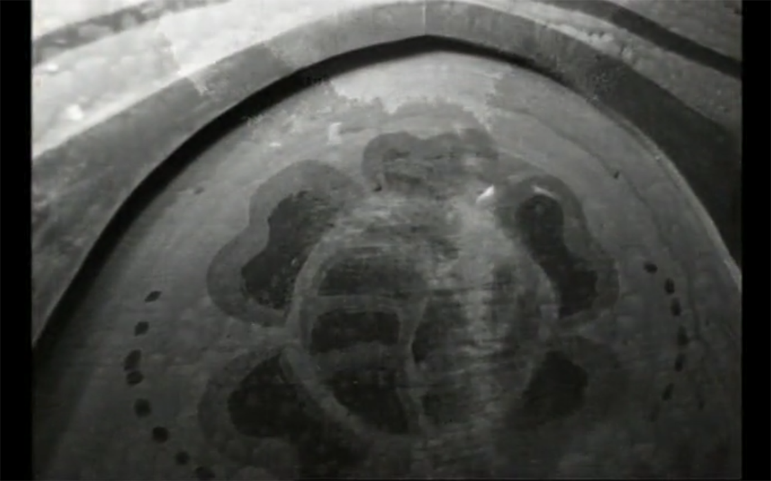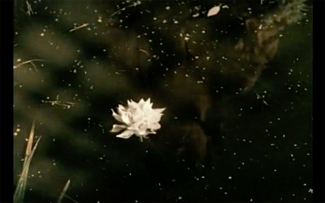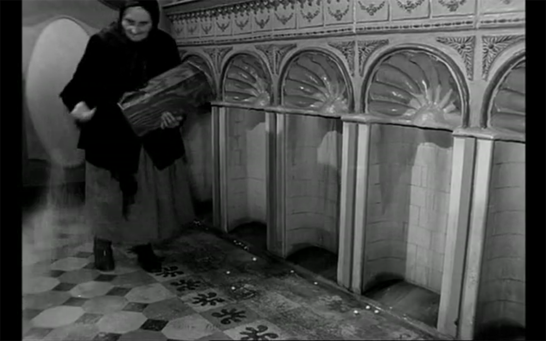El baño donde vive la anciana posee una decoración art-decó con múltiples motivos y formas vegetales. Luego, en los flashbacks, las imágenes nos muestran cómo la anciana vivió, durante un largo periodo de su juventud como campesina, lejos de la ciudad de Cracovia, antes de la Primera Guerra Mundial. También, se aprecia cómo se vio obligada a trasladarse a la ciudad polaca hasta acabar usando este baño como “hogar”. De ahí, ese posible uso de las formas vegetales, aludiendo a ese pasado campestre, a primera vista, inimaginable para un personaje así, pero que, descubrimos gracias al empleo constante de fundidos encadenados y otras técnicas que conectan el escenográfico motivo vegetal con su correspondiente recuerdo en flashback. Como es el caso de la imagen de una flor blanca en el río dentro del flashback (Imagen 5) evocada en el presente narrativo, por medio de la decoración de una de las puertas del baño (Imagen 6).