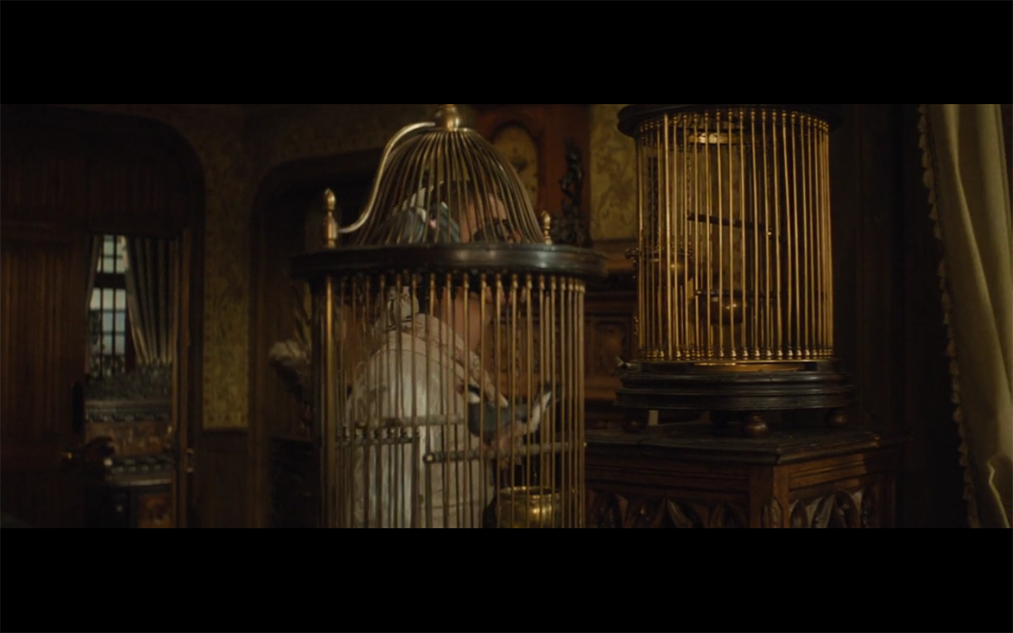 Sin embargo, los rasgos apreciados en torno a estos No-Hogares no siempre tienen, necesariamente, que hallarse en torno a películas donde la atmosfera escénica evoque, de algún modo, cierto pesimismo existencial, como el caso de la trilogía de apartamentos o la citada en la introducción El escritor. Un importante ejemplo de ello es el filme posterior a la trilogía terrorífica aquí comentada Tess (Roman Polanski, 1979) donde la atmósfera escenográfica, mucho más lumínica, evoca más al romanticismo pictórico, que al expresionismo visto en este escrito. Aun así, eso no es óbice para que apreciemos, aunque quizás de forma más leve, ciertos rasgos como la claustrofobia visual o la sugerencia de formas enjauladas, en alusión a una característica del protagonista o algún tormento que el mismo vive o vivirá. Es el ejemplo de una secuencia en la que, la protagonista Tess (Nastassja Kinski) aprecia, atentamente, unas jaulas de oro en el primer tramo de la película (Imagen 11), en alusión a su mal devenir personal, en el resto de la misma. Puesto que, a posteriori de esta contemplación, será forzada físicamente por el dueño de la casa en la que trabaja y donde se hallan las jaulas de oro. Todo esto ayuda a realzar la necesidad de entender y analizar este “dispositivo escenográfico-psicológico” como la posibilidad de una delgada, pero apreciable, línea visual que une gran parte de la filmografía de Roman Polanski.