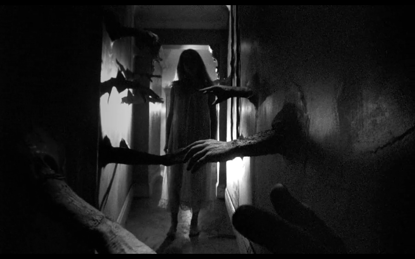 En Repulsión, el sentido claustrofóbico-visual es muy similar. Hay un momento dado en el que la protagonista también accede al espacio del baño; en una imagen con claros paralelismos visuales a la entrada de la anciana en el baño de Cuando los ángeles caen(Imagen 4). En la misma imagen de la que hablamos, no solo se resalta visualmente el cerramiento espacial, sino, también, simbólicamente por medio de los brazos masculinos que flanquean a la protagonista. Debido a que Carole (Catherine Deneuve), la protagonista de Repulsión, sufre una patológica animadversión hacia el sexo masculino, de ahí que muchas de las “alucinógenas”9 transformaciones de la arquitectura del apartamento sean metáforas acerca de la virilidad, como lo son estos robustos brazos que se desarrollan en las paredes. Tanto este uso de la iluminación, como el carácter simbólico nos remiten al expresionismo dado que, como dice Jean Mitry (2002) en su volumen sobre Estética y psicología del cine acerca del expresionismo: