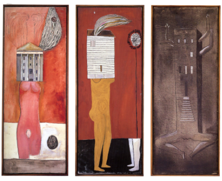 De manera inmediata, y a modo de antecedente en estas temáticas, una de las primeras asociaciones visuales que podemos hacer con la obra de Chantal Akerman corresponde a la serie pionera de pinturas de la artista nacionalizada estadounidense Louise Bourgeois, específicamente, con su Femme maison [Mujer casa] (Figura 3). En donde es más que evidente que los cuerpos femeninos están construidos o hibridizados con casas o edificios, haciendo alusión al espacio doméstico en el que habían sido y son recluidas las mujeres. Si la propuesta visual de Bourgeois apunta al espacio corporal tomado por hogareño, por la apariencia simbólica exterior de una arquitectura cuadrada de casa, el significativo aporte de Akerman es una mirada en la intimidad de lo que ocurre dentro de esas cabezas/casas, en esas identidades/hogar o cuerpos/objetos.