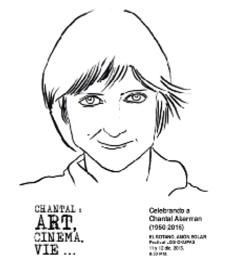 Es evidente que este no es el caso del trabajo audiovisual: Chantal: art, cinema, vie… presentado en el Festival Los Okupas, San José, Costa Rica, en diciembre de 2015 (Fig. 1). Dicho trabajo surge a partir de la noticia de la muerte de la cineasta belga Chantal Akerman (1950), en octubre de 2015. Se reúnen Ronald Bustamante (noise) y Susan Campos (compositora), junto a la voz de Ana Echandi, la colaboración en curaduría visual de Ernesto Calvo y la edición del video por Catalina Barrantes. Lo que proponen, en vez de un homenaje es un exorcismo, quizás de su suicidio, a los 65 años, quizás por el impacto de su obra y la repercusión de sus inquietudes, quizás por ambas razones y muchas otras. Como bien lo mencionan los artistas en sus notas de presentación al evento: “hemos decidido hacer una suerte de ‘exorcismo’ más que ‘homenaje’, es decir: una forma de convocarla y darle nuevamente vida a sus irreverencias artísticas y humanas, más que reverenciarla y petrificarla cual estatua” (Calvo, s.f.).