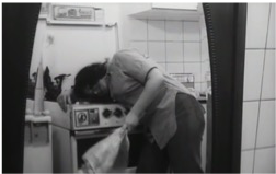 Inclusive diríamos que Saute ma ville (1968) corresponde a duelos y muertes, no lloradas y no llorables; no efectuadas y no aceptadas, de muertes voluntarias discriminadas y de feminidades que no se amoldan a los roles impuestos y a las cotidianeidades heredadas. De feminidades alienadas al borde, realizando los quehaceres y fallando en ello, que gritan desesperadas a modo de tarareo ese “yo no soy rubia” (como estereotipo), que se encuentran atrapadas desde una cocina sin-sentido, con un ramo de flores, mientras encienden el gas (Figura 2). ¿Cuáles serían nuestras pérdidas personales repudiadas, no reconocidas y no lloradas, reflejadas y vociferadas en la obra de Chantal Akerman? ¿Son posibles otras maneras de vivir el duelo y la melancolía? ¿Cuáles sería las consecuencias políticas, culturales y subjetivas de la expresión de esta melancolía identitaria? Hay mucho ruido en todo esto.