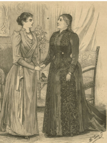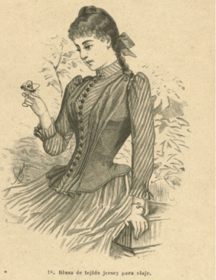 Por su parte, la mujer joven lleva un traje de dos piezas con falda larga hasta el suelo y corpiño tipo chaqueta, muy entallado. El cuello y los puños están confeccionados en un material contrastante y luce mangas jamón con volumen en los hombros. Su cuerpo se nota definitivamente moldeado por el corsé. Los figurines de modas presentan evidencias visuales de la feminidad ideal del período. Las mujeres que se representan en estas imágenes se encuentran encorsetadas, con el típico corsé de finales del siglo XIX. Esta prenda interior proporcionaba un aspecto característico: cintura muy marcada, busto amplio, caderas llenas y el torso empujado ligeramente hacia delante. En sí, los corsés admiten lecturas muy complejas12 que se relacionan con la manera adecuada de presentar el atractivo sexual de las mujeres en una sociedad tan reprimida como la de finales del siglo XIX.