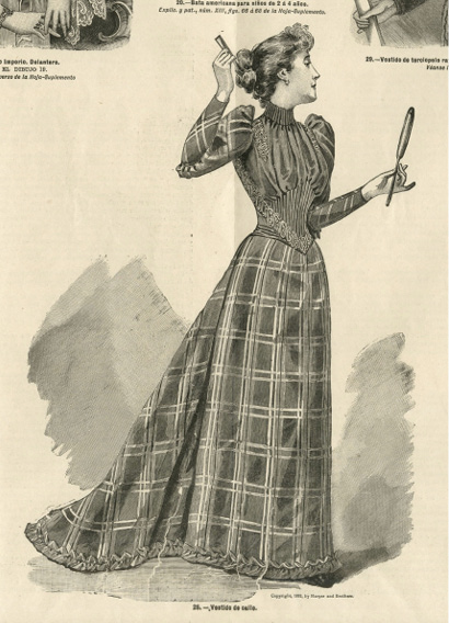 Los vestidos de cuadros aparecen con frecuencia en los figurines del acopio. Por ejemplo, La Moda Elegante muestra un vestido de calle de tela escocesa de cuadros, combinada con tela lisa de paño en un color similar (fig. 13). Las mangas jamón que muestran los vestidos de la fotografía aparecieron a partir de los primeros años de la década de 1890. Su característica principal era un aumento del volumen en el hombro, el cual se ajustaba al llegar al codo o la muñeca. Este cambio en la silueta de las mangas permitía distinguir visualmente los trajes más a la moda de aquellos que habían quedado rezagados según avanzaba el decenio.