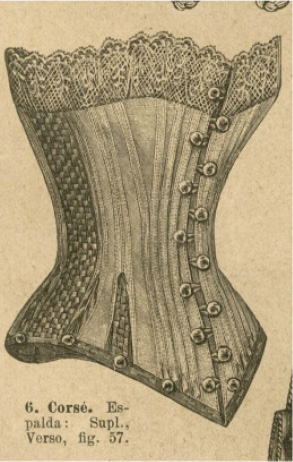 El uso del corsé era obligatorio en las mujeres de clase alta, quienes debían llevar esta prenda en todo momento. La figura 15 muestra un corsé, descrito así: “Una señora bien adecuada no está nunca sin corsé, á no ser que esté enferma. … Se pondrán botones para sostener el pantalón y las enaguas [sic]” (La Estación, 1o de octubre de 1889, p.146)o. La obligación de encorsetarse aparece con frecuencia en los figurines. Se insiste en que una mujer decente nunca se presenta sin haber moldeado firmemente su cuerpo con esta prenda interior. De esta manera, la utilización del corsé por las mujeres costarricenses denota su conexión con los ideales femeninos “afrancesados”: se utiliza el recurso visual del cuerpo moldeado por el corsé para evidenciar la pertenencia a la clase de mujeres “decentes” y “de buena familia” que leen y asimilan los contenidos de los figurines.