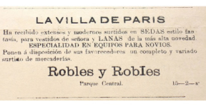 Por su parte, las damas de clase alta “tenían para elegir entre listones, abalorios, aretes, guantes y medias como accesorios a sus vestidos, además de perfumes, colonias y polvos de arroz. Para confeccionar los trajes, los almacenes ofrecían las más variadas telas: “algodones y linos, sedas provenientes de París, Londres y China” (Vega Jiménez, 1991, p. 65). Como parte de sus importaciones, Costa Rica recibía telas y pasamanerías provenientes de la capital francesa. Así puede apreciarse en los anuncios publicados por Elisa M. de Bellard (fig. 17) y por la tienda La Villa de París (fig. 18). Estos objetos permitían seguir los dictados de los figurines de moda, los cuales guiaban el consumo de las mujeres de la élite en nuestro país.