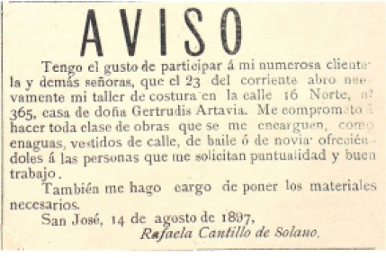 Anuncio de la costurera Rafaela Cantillo [fotografía]. En La República (14 de agosto de 1897).
