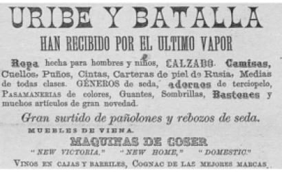 Anuncio de máquinas de coser en la tienda Uribe y Batalla [fotografía]. En El Anunciador costa-ricense (1 de setiembre de 1889). Recuperado de: http://www.sinabi.go.cr/.