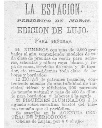 El hecho de que una revista insistiera en que sus grabados y sus textos reproducían fielmente lo visto entre las mujeres elegantes de la capital francesa, se convertía en una especie de garantía para las lectoras de centros urbanos alejados, quienes podrían seguir estas pautas y evitar la vergüenza que produce el utilizar prendas atrasadas. La revista La Estación reafirma estas ideas en sus textos: “Además, si nuestras lectoras siguen los patrones é indicaciones de nuestro periódico, pueden estar seguras de vestirse con arreglo á la última moda y sobre todo con distinción, lo cual es de suma importancia” (16 de noviembre de 1894, p. 169).