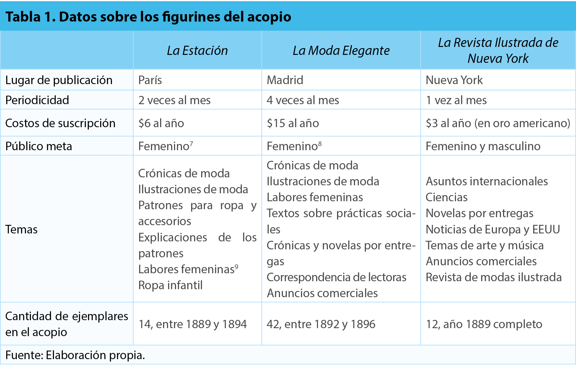 De este modo, puede afirmarse que estos figurines de moda llegaban al país y eran consumidos por un público de clase alta que podía utilizar la información para acercarse al gusto francés en la vestimenta. A fin de comprender el tipo de información que ofrecían los figurines de esta colección, la tabla 1 (ver página siguiente) detalla las características de estas publicaciones.