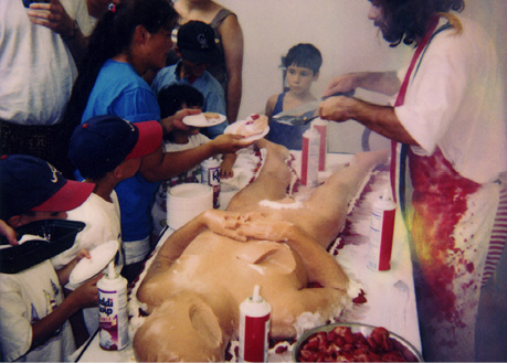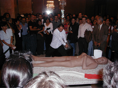 Esta práctica artística fue realizada en el Museo de Arte Contemporáneo Carrillo Gil, en el marco del evento Las transgresiones al cuerpo. La reacción del público, después de escuchar el discurso político- religioso, consistió en besar y cortar al cuerpo en pedacitos y llevarse un “itacate”.