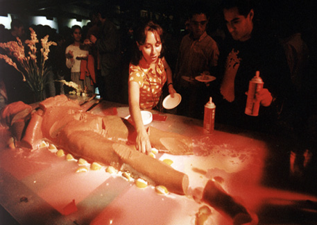El primer cuerpo humano entero comestible que realicé fue un cuerpo femenino de gelatina sabor frambuesa. Era rojo y transparente y tenía frutas tropicales en su interior simulando los órganos. Las reacciones en el Museo de Arte Moderno en México no se hicieron esperar. La mayoría de los hombres ahí presentes se tiraron el cuerpo a lamidas y mordidas libres. Fue un perforWOMANcena. (Comeos los unos a los otros, Martínez-Silva, s.f.)