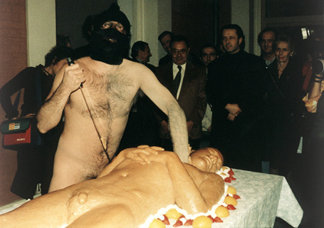 Esta perforMANcena se replicó en el Instituto de Arte Contemporáneo de Londres, en noviembre de l996. La reacción del público fue desbordada: descuartizaron el cuerpo, lo rebanaron, degollaron, y sus miembros terminaron regados por todo el escenario. Curioso, relata el artista, “en contraste con el anterior, este cuerpo humano masculino fue ‘castrado’ por un hombre muy elegante”.