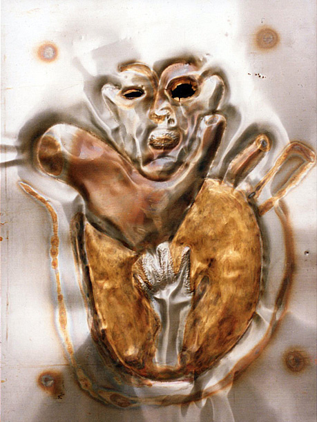 Serie Explosiciones. “Co-Razón Explosivo” (1989). Dinamita y nitroglicerina sobre acero inoxidable, 70 x 56 cm, Northwood, New Hampshire, USA.