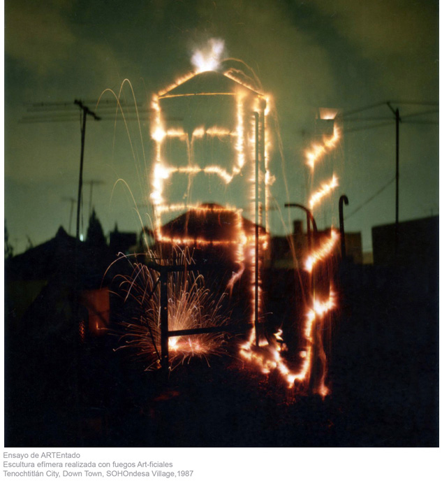 Serie Explotarte. (1987). Escultura efímera realizada con fuegos Art-ficiales, Tenochtitlán City, SOHOndesa Village.