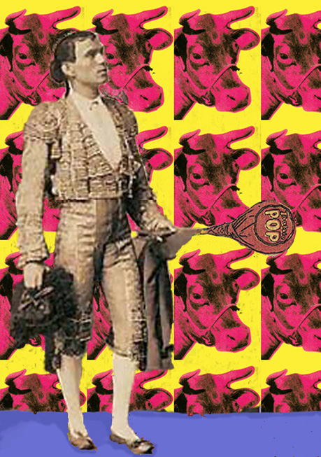 El rango interpretativo de la isotopía anterior se alimenta de connotaciones plásticas que hacen referencias al pop art. Poner como telón de fondo las polaroides del icónico de la serigrafía de los años setenta, Andy Warhol, hace bascular la descisión intepretativa, ya que es la repetición de la cabeza de toro y este tono rosado fluorescente que caracteriza la paleta de color del artista, lo que le arrebata el protagonismo al torero retratado en la fotografía original.