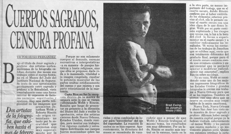 Seis meses después, en diciembre de ese mismo año, se censura y se cierra la exposición Amor Sagrado y Profano (Fig. 13), de los artistas Roberto Rincón y Jonathan Webb, la cual se presentaba en la Sala de Exposiciones Temporales Fidel Tristán, ubicada en el Museo de Jade. La muestra fue aceptada por la directora en ese momento, Zulay Soto, y cerrada sin su consentimiento, debido a los comentarios de desaprobación de los visitantes. La exhibición mostraba fotografías de hombres y mujeres desnudos. La exposición fue abierta nuevamente y permaneció hasta febrero de 1996, después de que los artistas aceptaron retirar las fotografías que se consideraban más escandalosas.