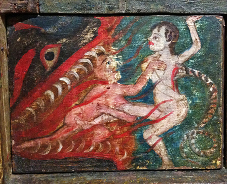 Por otro lado, muy pocas manifestaciones alrededor del tema del cuerpo en la Época Colonial, en Costa Rica, han sido encontradas. Es posible citar como excepción el detalle del camarín, propiedad del Museo Nacional3, donde unos mal esbozados Adán y Eva, en una posición bastante sugerente, son parte del imaginario del pecado original (Fig. 2).
