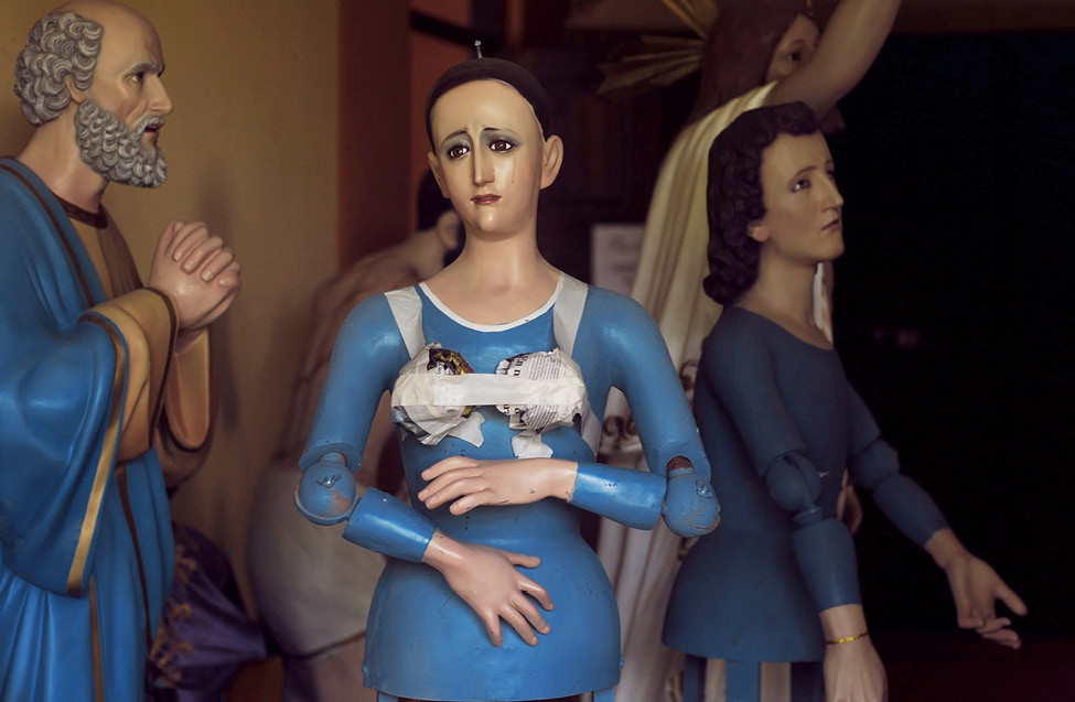 Anatómicamente, sólo se permitía trabajar en la figura semidesnuda de Jesús crucificado; fue ahí que los artistas imagineros volcaron toda su creatividad. Muchas de las representaciones eran de estuco, asexuadas, y habían sido transformadas, dependiendo de lo que se requiriera. Un San Juan con rasgos sumamente femeninos, o una Virgen, dependían del ropaje o de los accesorios y no de su anatomía. Como lo demuestra la imagen de Alejandra Guzmán, esta técnica sigue siendo utilizada hoy día, donde con una simple cinta adhesiva se le “agregan senos” a un San Juan, quien pasa como por acto mágico a ser Magdalena o Santa Marta; en este sentido, son santos, por decirlo de alguna manera, “transformistas” (Fig. 3).