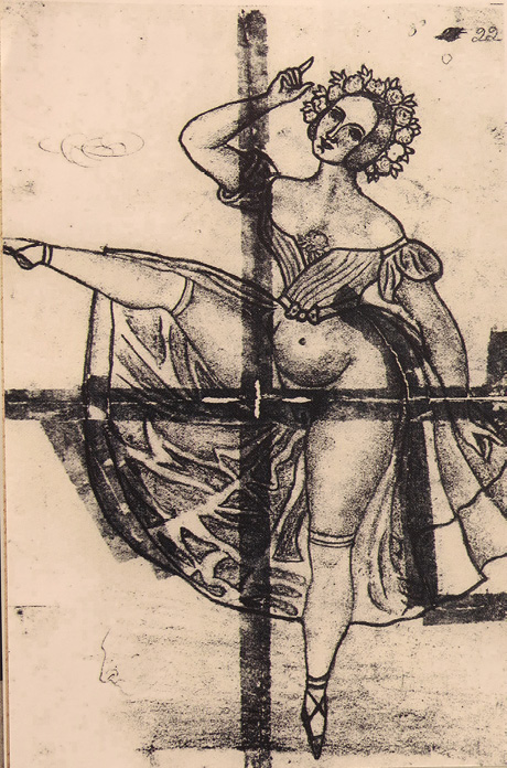 El dibujo que sobrevive (Fig. 4) es parte del extenso documento que se conserva en el Archivo Nacional, rústicamente reparado con cinta adhesiva. Este muestra a una mujer esbelta en la postura clásica del baile de cancán –con su pierna abierta y su vulva expuesta– el cual se había vuelto famoso en la Francia de 1840 y al que se consideraba obsceno y escandaloso. En los cabarés las mujeres salían con bombachas, pero en los bares de los barrios bajos mostraban su pubis desnudo. No es de extrañar que Figueroa pudiera haber tenido acceso a imágenes parecidas, pues era el tipo de estampas eróticas que circulaban en la época y que se hicieron muy populares antes de la aparición de las imágenes fotográficas.