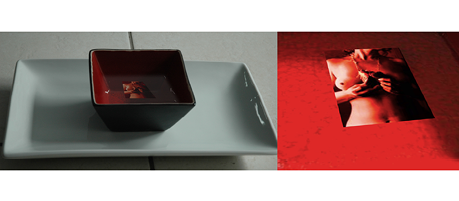 En este caso, se establecieron relaciones alegóricas con la copa (el grial), el recipiente, el útero, la fecundidad, la luna, la serpiente, el dolor, la sangre y las mareas. Asimismo, se utilizó el elemento agua y el corazón como metáfora de dolor. Se instaló una fotografía flotando en este líquido (fig. 10). La imagen seleccionada fue parte de otra obra desarrollada anteriormente (pero en miniatura), la cual tenía el tamaño aproximado de una fotografía pasaporte. Esta consistió en un torso femenino rojo con un corazón de carne real totalmente abierto, que rememoraba, en su forma, a unos labios vaginales (Fig.9).